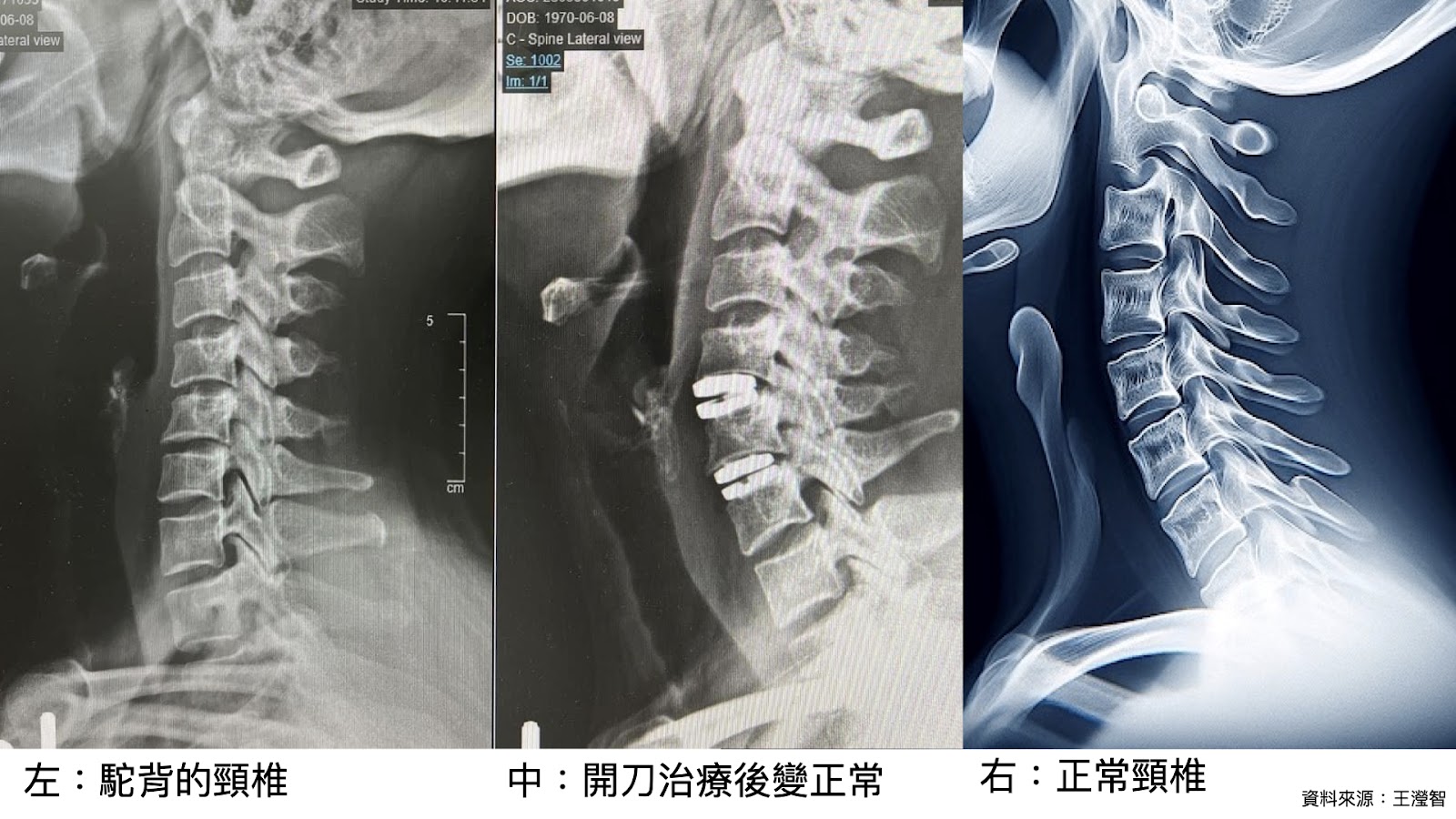 傳言提到「每天半小時去外面放風箏,一個星期頸椎全好了」。MyGoPen 致電諮詢臺北市中山醫院骨科醫師、長庚大學助理教授王瀅智,他表示表示,頸椎正常的時候,就是一個稍微前凸(lordosis)的狀態,但是低頭族的「頸椎前傾」(Forward head posture)會變成像是烏龜頸,脖子前傾的角度就會變窄,臨床上常常可以看到病患的側面 X 光頸椎整個往前、變成一直線。王瀅智指出,人體在標準站姿時,頭部的重量大約佔體重的 10 分之 1,也就是體重 60 公斤的人,頸部大約需要承重 6 公斤,但是當滑手機、看螢幕時,假設低頭前傾 30 度,這時力矩 3 倍、頸椎需支撐的重量變成 18 公斤,而前傾 45 度時,頸椎要承重 5 倍、也就是 30 公斤。