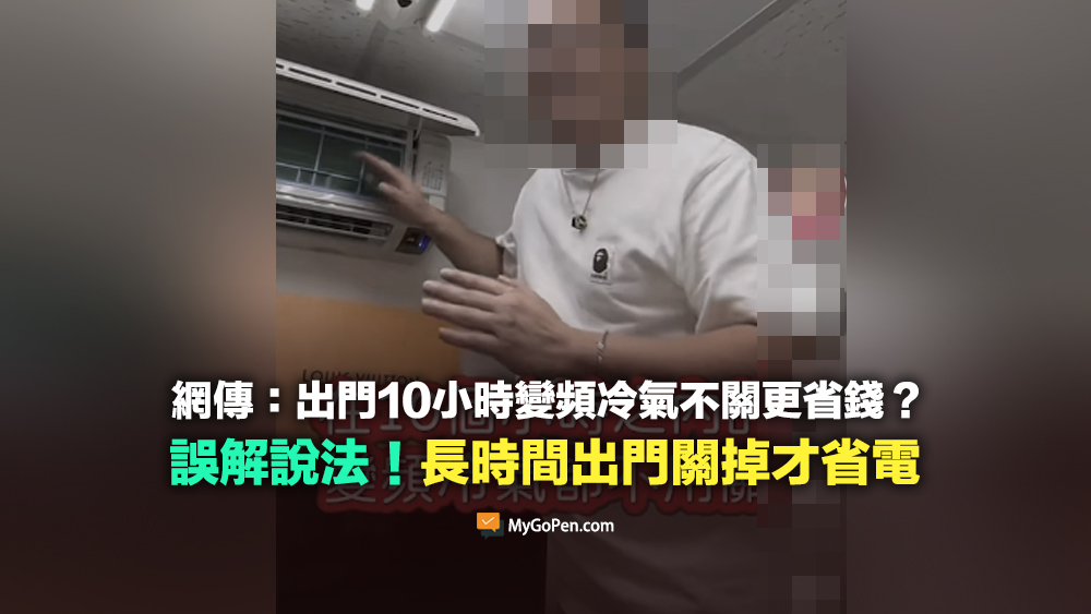 網傳「網傳出門 10 小時回家,變頻冷氣不關省錢」的訊息和影片。經查證,台電表示,傳言影片對冷氣的使用時間狀況有誤解,如果 10 小時不關冷氣,因為需要維持室內固定溫度,冷氣壓縮機仍持續運轉耗電,因此,台電建議,用戶如白天上班長時間出門時,仍須將冷氣關掉,才能節省用電及電費。