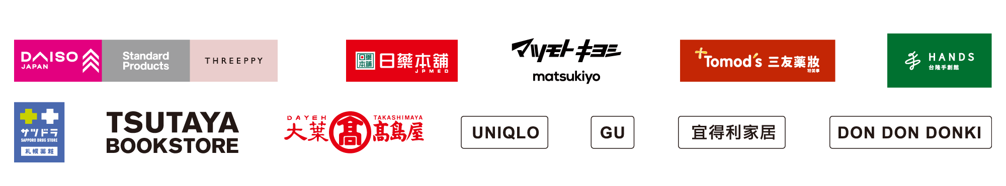 ★遠東SOGO百貨、太平洋百貨、新光三越、SKM Park、遠東百貨、Big City遠東巨城購物中心、微風廣場、誠品生活、環球購物中心、CITYLINK、BELLAVITA、統一時代、台北101等。