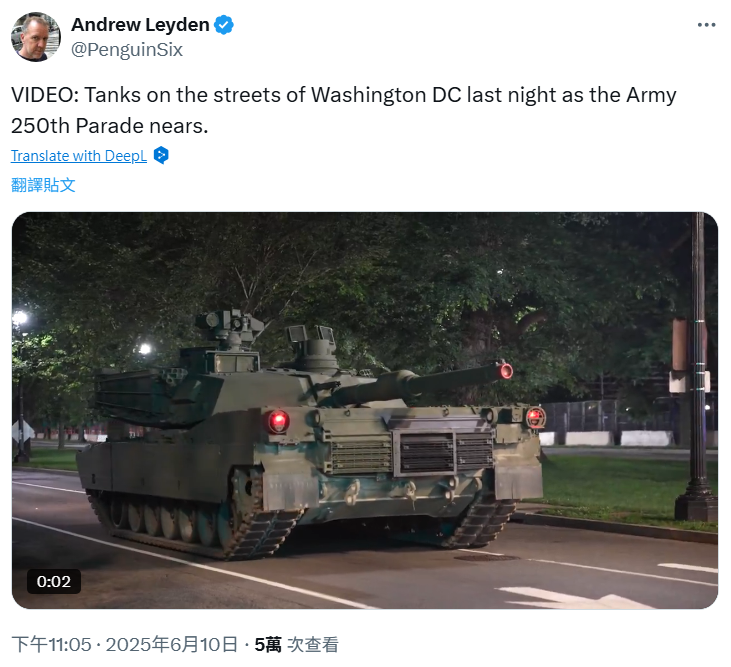 (一)透過影片反搜工具 InVID 分析網傳影片的關鍵畫面後進行搜尋,初步先查找到自由撰稿人 Andrew Leyden 於 2025 年 6 月 10 日在 X 上曾發布相同的影片,推文中指出,這是前一晚拍攝的畫面,隨著時間越接近美國陸軍成立 250 週年的閱兵儀式,有坦克出現在華盛頓特區的街道上。