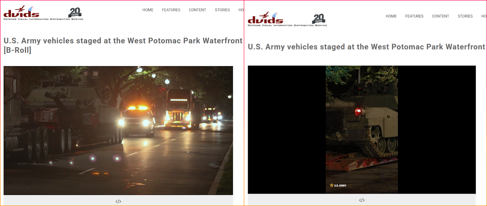 (三)美軍「國防視覺資訊服務網站」(Defense Visual Information Distribution Service,DIVDS)在 2025 年 6 月 10 日發布許多坦克車抵達華盛頓特區的照片和影片,在其中可以看到有和網傳影片相似的畫面。