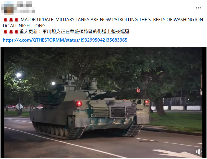 網傳「軍用坦克正在華盛頓特區的街道上整夜巡邏」的訊息和影片。經查證,傳言影片其實是和美國陸軍慶祝成立 250 週年,在 2025 年 6 月 14 日舉辦的閱兵儀式有關,從德州來的坦克、戰車於 6 月 9 日陸續抵達華盛頓特區,它們是為遊行準備的,並不是在巡邏,傳言所述為錯誤訊息。