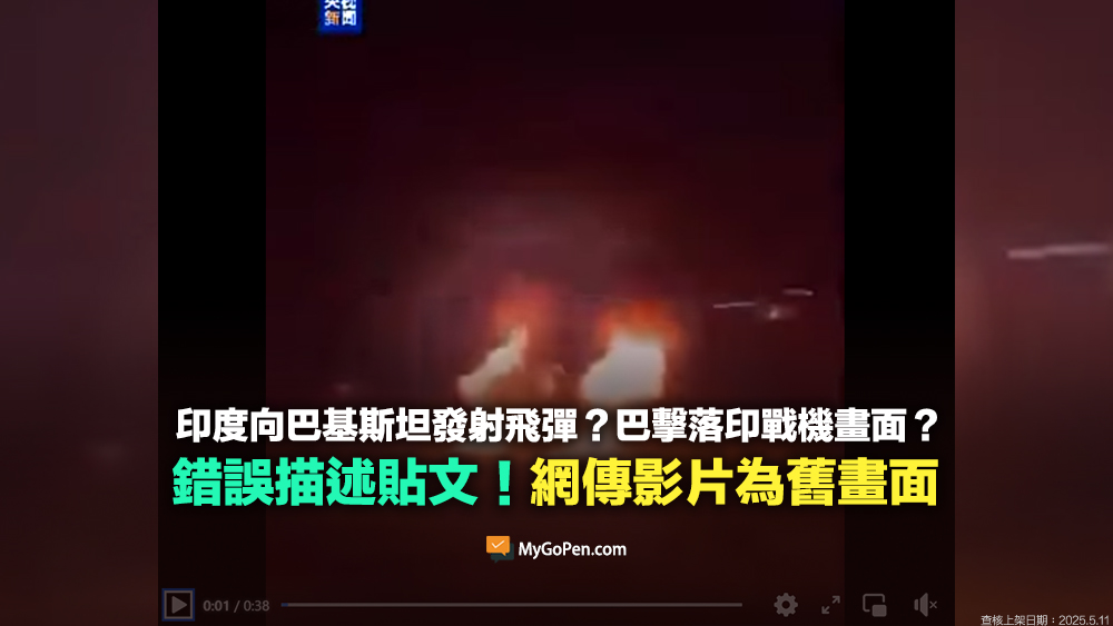 網傳「印向巴發射飛彈,巴擊落印戰機,一夕之間印巴大打出手」的訊息和影片。經查證,傳言影片最早出現的時間至少是 2024 年 5 月 26 日,可確認和 2025 年 4 月 22 日開始的印巴衝突無關。根據發布影片的社群帳號表示,這是巴基斯坦軍方某一次夜間演習的畫面,傳言影片為錯誤訊息。