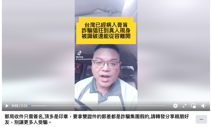網傳「詐騙集團現在改扮演郵差騙老人家雙證件」、「台灣已經病入膏肓」的影片及訊息,內容聲稱詐騙集團會假扮成郵差,以寄送包裹方式要求民眾攜帶雙證件領取,並透過讀卡機竊取身分證、健保卡資料。經查證,台灣近期並沒有出現如網傳假郵差詐騙的案例,目前也沒有具體的被害案例出現;目前台灣的身分證沒有晶片,因此無法以讀卡機插卡的方式竊取個資,而健保卡雖然有晶片,但要讀取資料必須另外輸入密碼,民眾無須過度擔心。