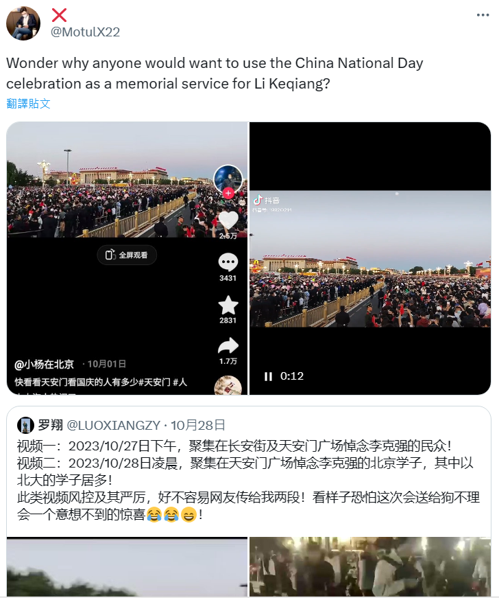 網傳「聚集在長安街及天安門廣場悼念李克強的民眾」的相關訊息和多則影片,宣稱是中國民眾悼念近期過世的前中國總理李克強。經查證,網傳影片中有兩則是 2023 年中國國慶時,民眾聚集在天安門廣場的畫面,另一則鳴笛默哀的影片,其原始事件是 2020 年 4 月 4 日中國舉辦 COVID-19 疫情默哀活動;傳言影片均和悼念李克強無關,為錯誤訊息。