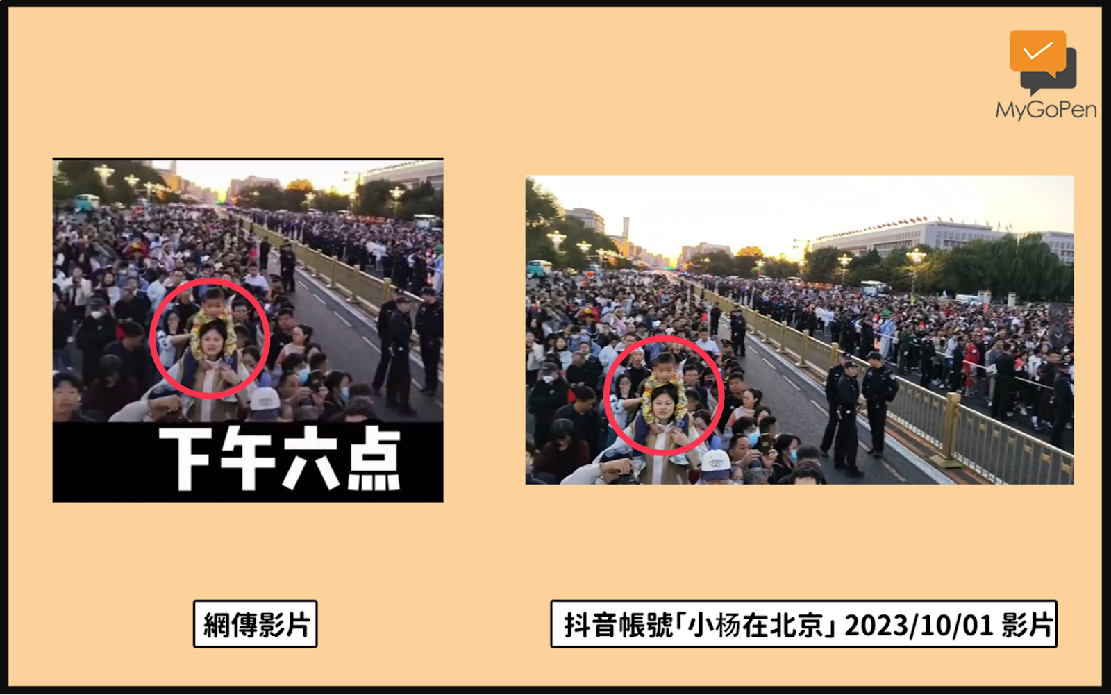 不過,查核記者在一則凌晨拍攝的影片中,發現有相同衣著的人,有一名男子身穿綠色外套、背上有黃色字樣;可以確認,網傳影片的原始事件是 2023 年 10 月 1 日凌晨民眾在天安門廣場等待升旗。