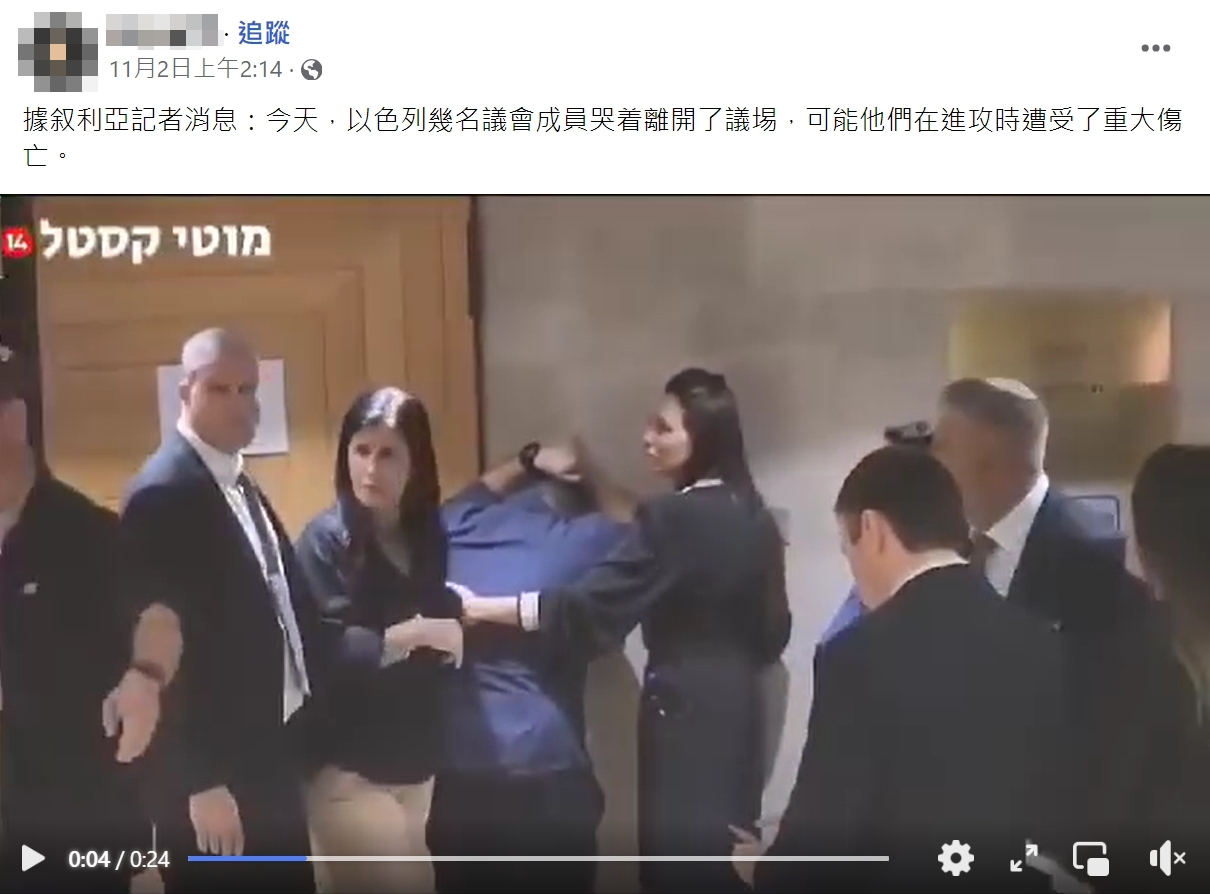 網傳「以色列議員哭著離開議場」的影片及訊息,內容聲稱以色列國會議員被媒體拍到哭著離開議場,疑似是因為在進攻哈瑪斯時軍隊遭遇重大傷亡。經查證,網傳影片拍攝於 2023 年 11 月 1 日,當時以色列國會在議場上播放哈瑪斯 10 月 7 日突襲的影片,不少議員看完後離開議場痛哭,並有一名議員昏倒送醫。網傳影片與以色列軍隊是否遭遇重大傷亡無關,網傳訊息不正確。