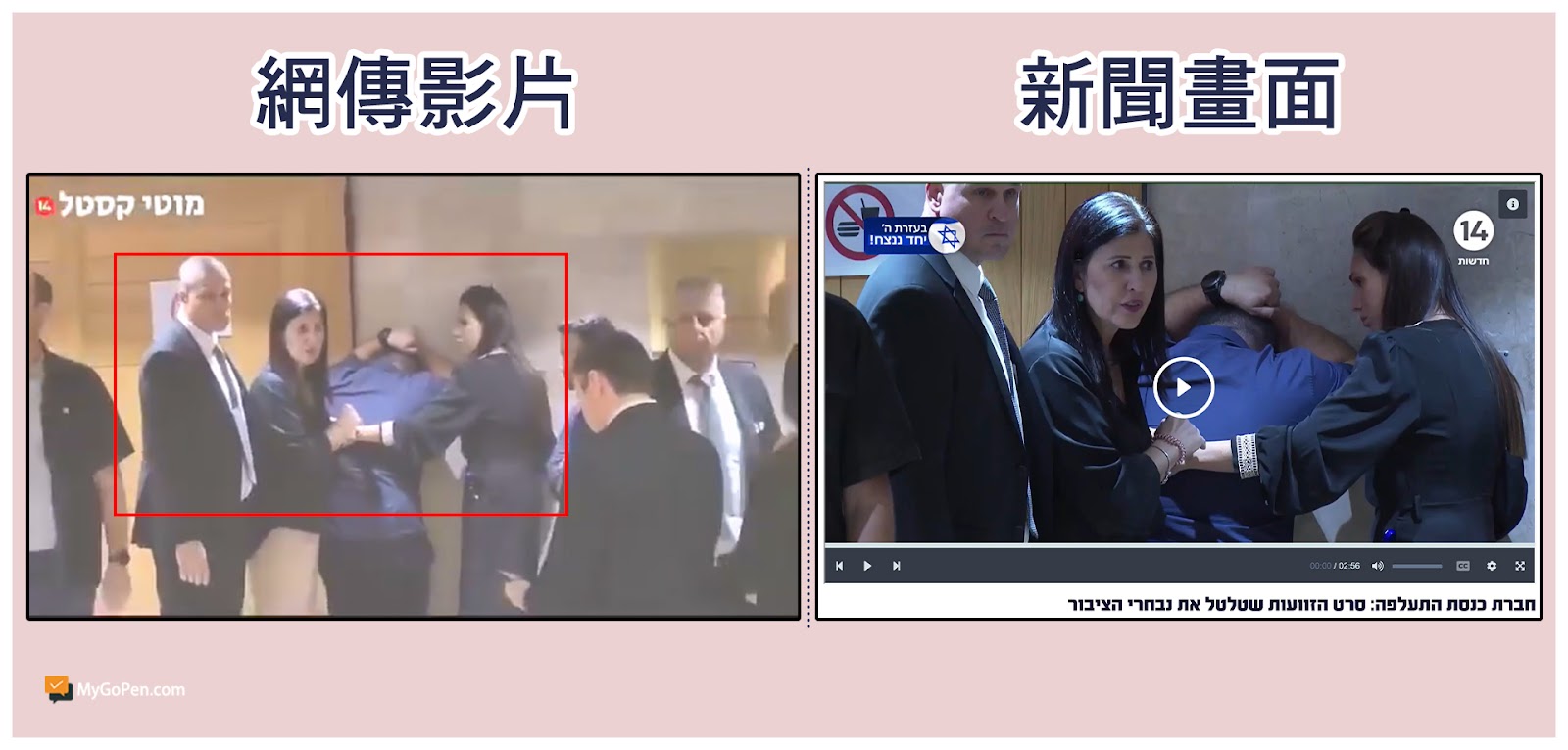 檢視網傳影片左上角浮水印,可以看到「 מוטי קסטל 」的希伯來文,以此進行關鍵字搜索,可以找到這是以色列媒體《 עכשיו 14 》記者莫蒂卡斯特爾( מוטי קסטל )的名字,檢視《 עכשיו 14 》官網,可以找到 11 月 2 日的報導《 חברת כנסת התעלפה: סרט הזוועות שטלטל את נבחרי הציבור 》,經檢視後確認與網傳影片為同一場景。