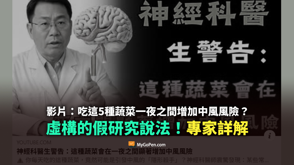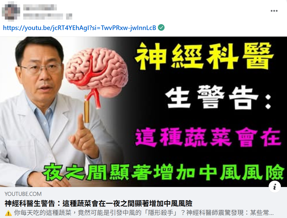 網傳「神經科醫生警告:這種蔬菜會在一夜之間顯著增加中風風險」,傳言提到玉米、馬鈴薯、番茄、甜菜根、菠菜為中風的高風險食物,睡眠期間新陳代謝變慢、是無聲的中風陷阱。但根據專家澄清的說法,顯示傳言所講的內容分別有顛倒是非、不知所云、本末倒置等謬誤,傳言嚴重錯誤,提醒民眾應以衛福部相關單位,例如國健署、食藥署、疾管署等,以及各大醫院,例如台大醫院、榮總、長庚、北醫附醫的官網或衛教素材,或是專科醫學會、學會,例如腦中風學會等等,才不會錯信傳言、危害健康。