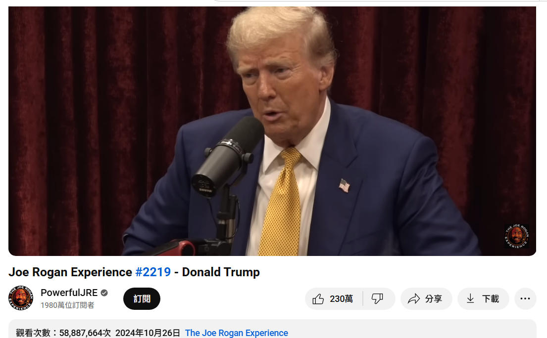 (一)透過影片反搜工具 InVID 分析網傳影片的關鍵畫面後進行搜尋,查找到 YouTube 頻道「PowerfulJRE」在 2024 年 10 月 26 日上傳的 Podcast 節目「喬羅根體驗」(The Joe Rogan Experience)第 2219 集中,川普的衣著、背景布幕均和傳言影片相同。