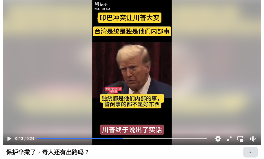 網傳「印巴衝突讓川普大變,台灣是統是獨是他們內部事」、「保護傘撒了,毒人還有出路嗎?」的訊息和影片。經查證,傳言影片畫面是出自美國總統川普在 2024 年登上 Podcast 節目「喬羅根體驗」的片段,他在節目中雖然有提到台灣,但主要是談及晶片和保護費等議題,完全沒有說到任何和傳言所述有關的內容,網傳影片是透過 AI 變造他的聲音並置換嘴型,為錯誤訊息。