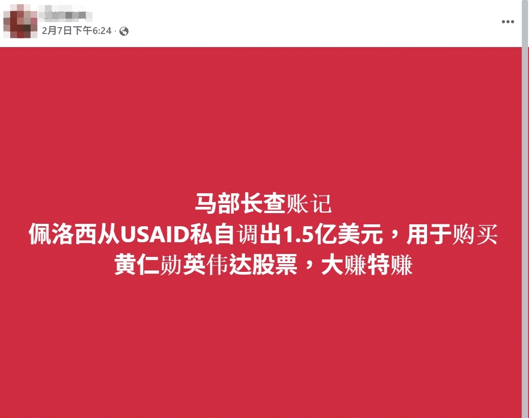 網傳「裴洛西從 USAID 調出 1.5 億美元」的訊息,內容聲稱馬斯克近期查出美國前眾議院議長裴洛西(Nancy Pelosi),自美國國際開發署(USAID)調出 1.5 億美元,購買輝瑞(NVIDIA)的股票,藉此大賺一筆。經查證,網傳訊息改編自 X 平台的謠言,原始出處來自一個專門發布戲仿與諷刺貼文的帳號,原始貼文聲稱裴洛西是獲得 1.37 億美元,購買輝達的期權合約,但沒有附上任何消息來源;檢視馬斯克本人 X 帳號、國際通訊社及國外媒體,皆沒有相關的資訊揭露,沒有證據顯示裴洛西曾使用 USAID 的錢購買輝瑞股票,網傳訊息不正確。