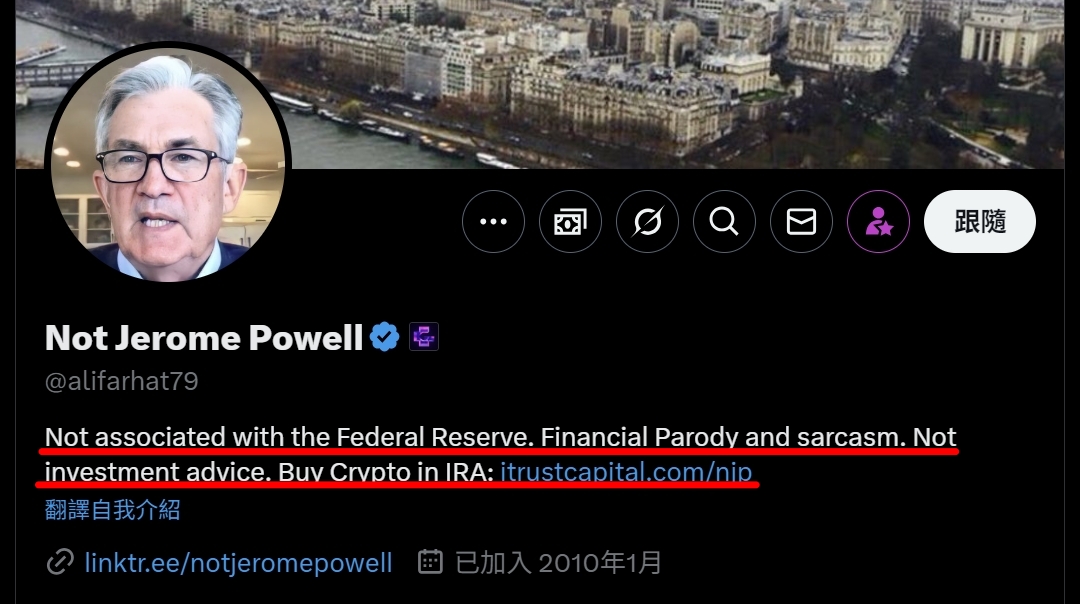 「David」引用的消息來源,出自另一名用戶「Not Jerome Powell」,他的頭像雖然是美國聯準會主席傑洛姆鮑爾(Jerome Powell),但他在個人簡介中,表示此帳號與聯準會(Federal Reserve System, Fed)無關,內容以財金相關的戲仿、諷刺貼文為主,且還附上推廣加密貨幣的網址。