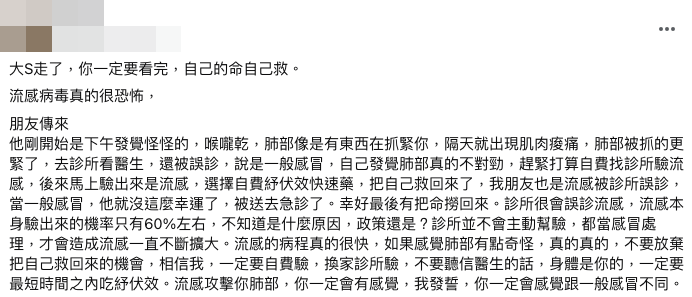 網傳「大S走了,你一定要看完,自己的命自己救」貼文,提到診所很會誤診流感,診所並不會主動幫驗,都當感冒處理、自費驗流感,以及自費吃紓伏效快速藥等。醫師表示,名人效應應該化作平時的防疫動力,珍惜健保資源、配合疾管署防疫之外,有心臟、肺功能、慢性病等病史的人,面對一般感冒或流感都應該非常小心謹慎地應對。