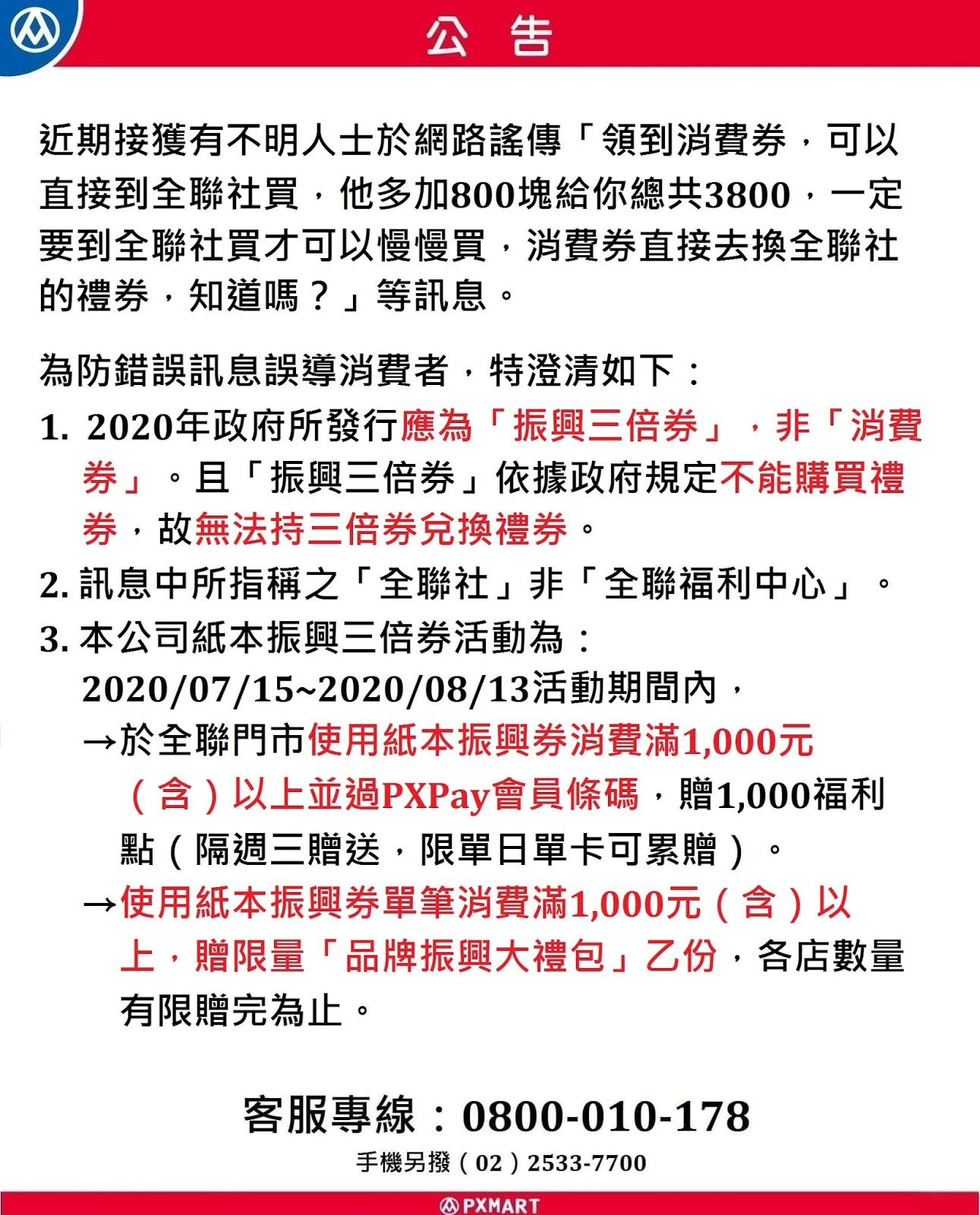對此全聯福利中心官方澄清,關於政府 2020 年所發行應為「振興三倍券」,非消費券,且三倍券依政府規定不能購買禮券,故無法持三倍券兌換禮券。此外,訊息中所稱「全聯社」,非「全聯福利中心」。