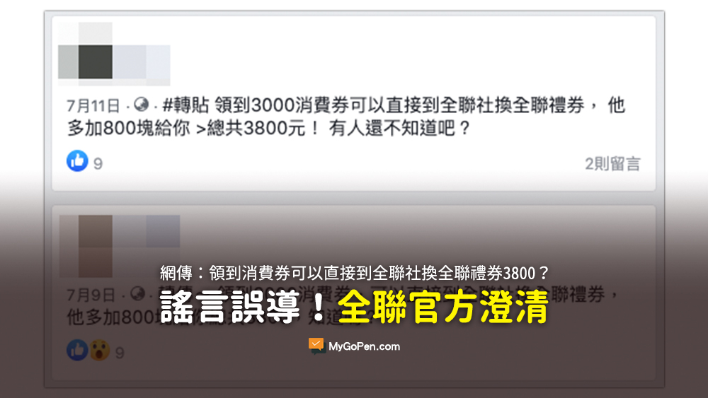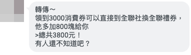 領到3000消費券可以直接到全聯社換全聯禮券 他多加800塊給你總共3800 謠言