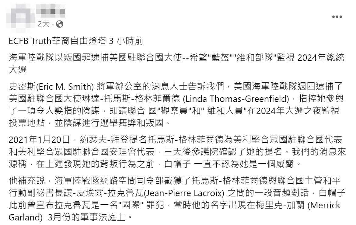 網傳「海軍陸戰隊以叛國罪逮捕美國駐聯合國大使」的訊息,內容聲稱美國海軍陸戰隊近期以叛國罪逮捕美國駐聯合國大使琳達湯瑪斯 - 格林菲爾德(Linda Thomas-Greenfield),因為她企圖讓聯合國觀察員及維和部隊監控 2024 年美國總統大選投票。經查證,網傳訊息出自 Real Raw News 上的文章,該網站以發布假新聞及陰謀論著稱。網傳文章於 2024 年 6 月 17 日發布,格林菲爾德在 6 月 25 日仍於聯合國發表多次談話,個人社群帳號也有持續更新近況,沒有證據顯示她遭到逮捕,網傳訊息為捏造內容,並非事實。