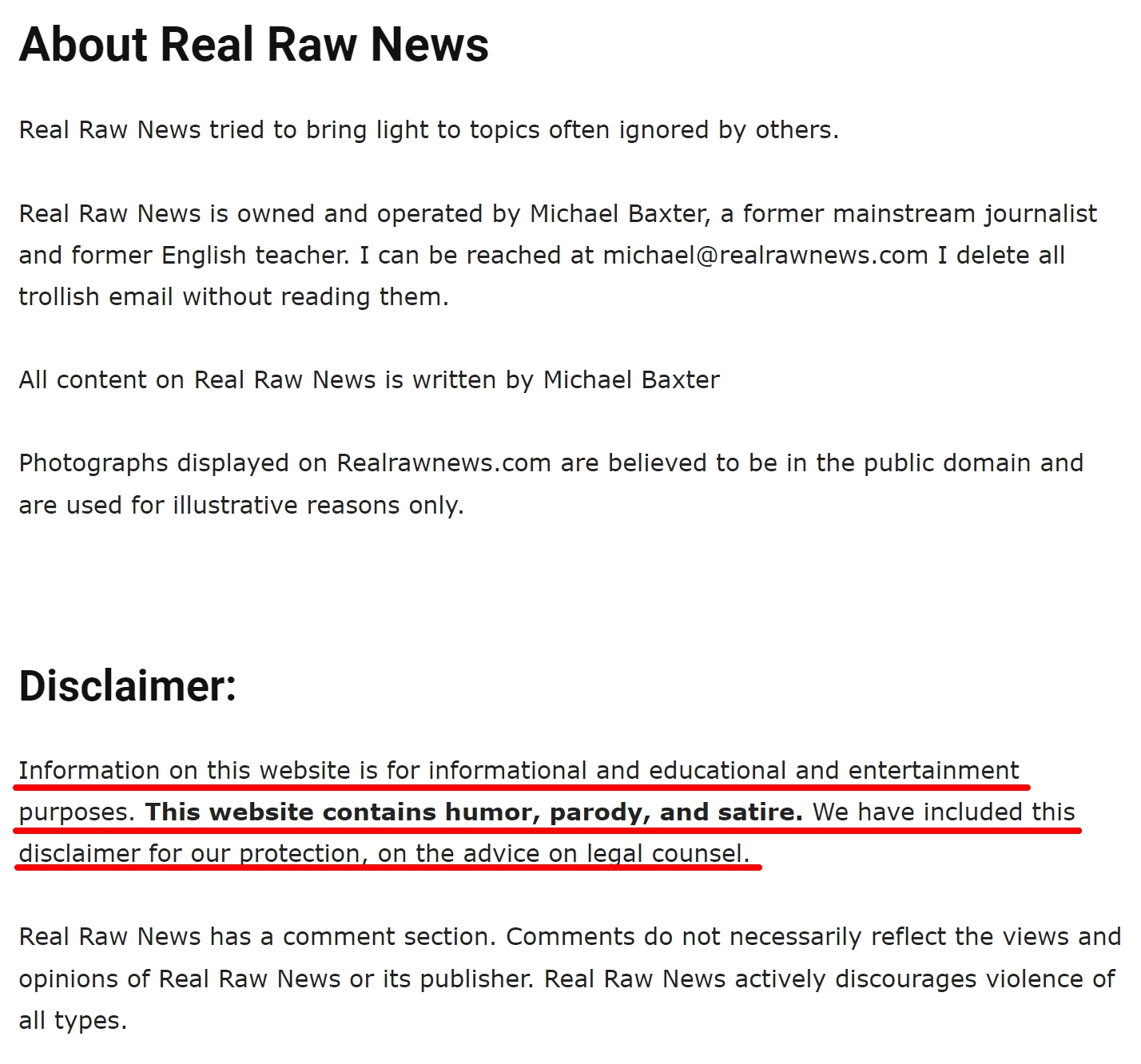 Real Raw News 網站在「關於我們」頁面中,其實也有註明「本網站的訊息用於提供消息、教育及娛樂目的,此網站含有幽默、模仿及諷刺成分」作為免責聲明,而該網站實際上發布的文章也大多為不實訊息或陰謀論。