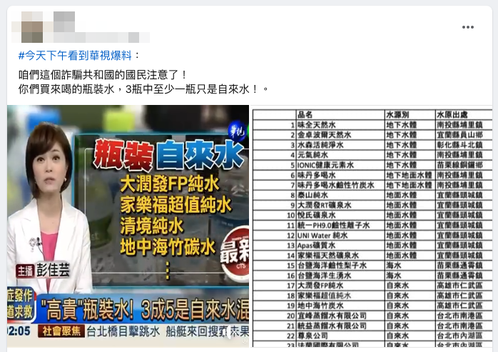 網傳社群平台貼文於 2024 年 7 月 20 日發布,提到「今天下午看到華視爆料」,但根據影片中的電視台標誌、關鍵字搜尋,可以發現是該電視台於 2014 年 4 月 21 日所報導的「"高貴"瓶裝水! 3 成 5 是自來水混充」,片中敘述的內容符合網站所登載的新聞影片文字稿,網傳貼文挪用 10 年前的新聞,卻講成為目前發生的事,是誤導的不實訊息