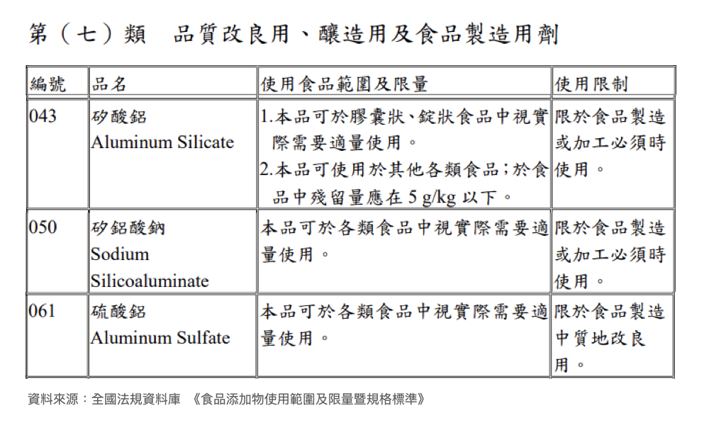MyGoPen 查詢衛福部公告的《食品添加物使用範圍及限量暨規格標準》,其中「 第(七)類 品質改良用、釀造用及食品製造用劑」中,共有 3 種成份含有鋁,編號第 50 號的「矽鋁酸鈉」,公告的英文即為 sodium silicoaluminate,與傳言所提到的成分名稱相符。