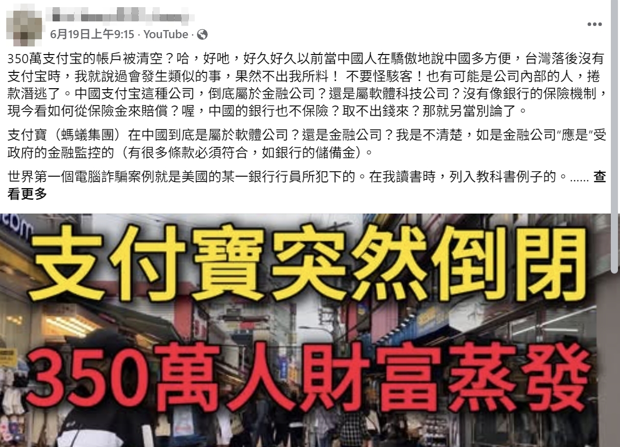 【錯誤】網傳支付寶倒閉?350萬用戶帳號歸零?虛構內容!出自內容農場頻道