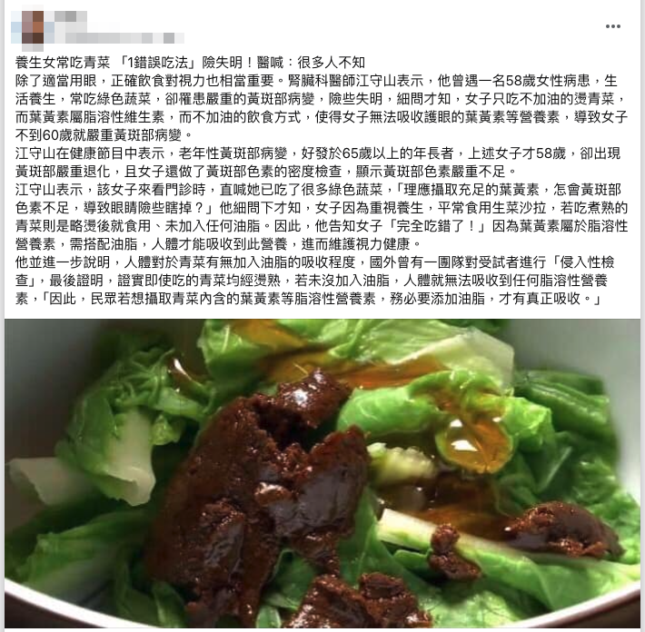 網傳「養生女常吃青菜 『1錯誤吃法』險失明!醫喊:很多人不知」貼文,提到某病例很養生常吃無油燙青菜,卻罹患黃斑部病變,原因是青菜雖有葉黃素,但吃錯、無油,導致葉黃素吸收不佳。但專家表示,不同人每天、每餐吃的食物種類很多,沒有人能靠只吃無油燙青菜過日子,只要同次進食還有吃進其他含有油脂的食物、就能幫到葉黃素的吸收,傳言說法故意凸顯、誇大某一道菜無油的單一問題,傳言易誤導。