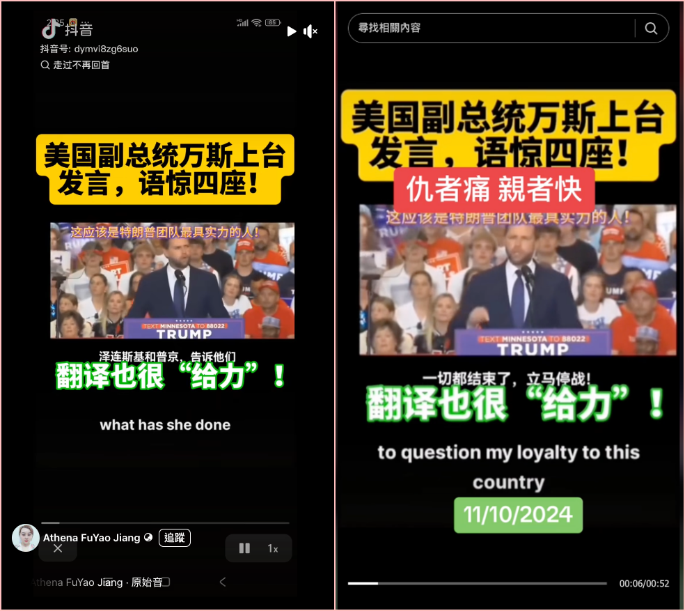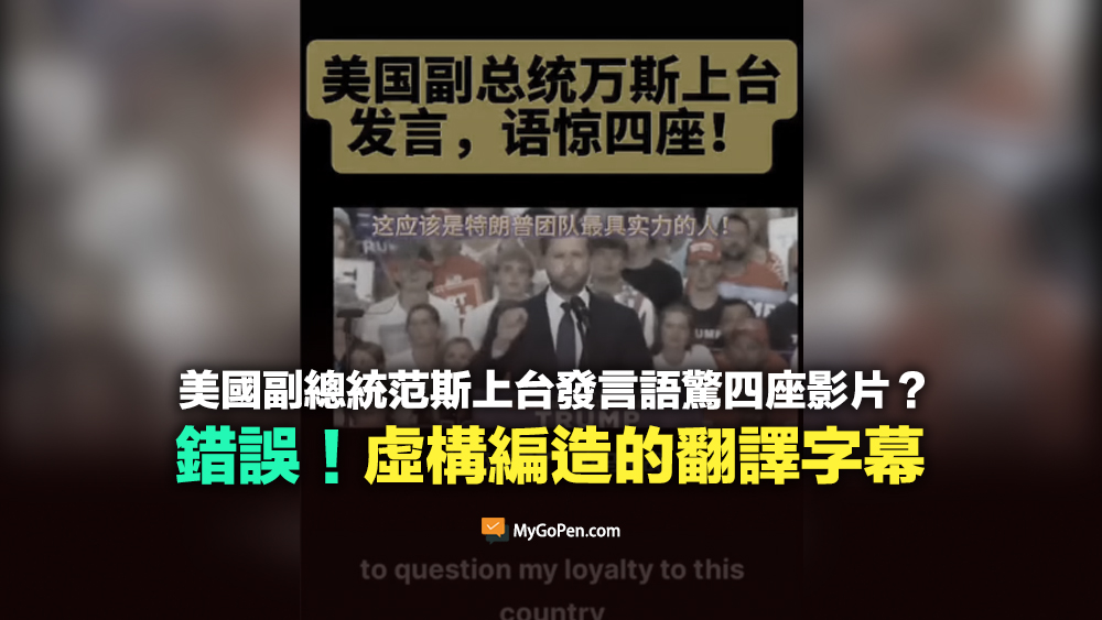 網傳「美國副總統范斯上台發言」、「語驚四座」的訊息和影片。經查證,傳言影片出自共和黨在 2024 年 7 月 27 日舉辦的明尼蘇達州集會,當時共和黨副總統候選人范斯反擊先前賀錦麗對他的質疑,賀錦麗之前抨擊他只對川普忠誠,簡體中文翻譯字幕完全錯誤,內容和范斯的原話沒有任何關係。