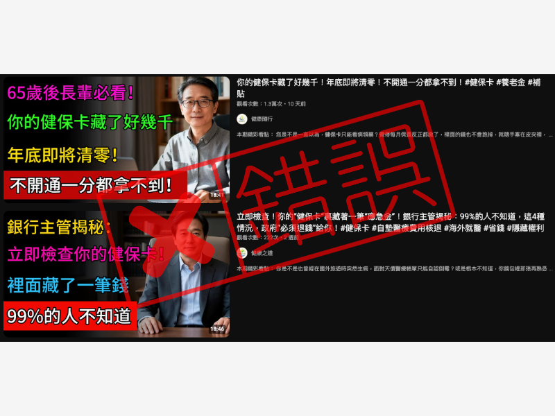 網傳「你的健保卡藏了好幾千!年底即將清零」、「不開通一分都拿不到」的影片貼文,提到政府正在推廣最新式、加載了金融功能的健保卡,只要到銀行辦理開通,就能領到相關補助、津貼。但健保署對此澄清,健保卡是「就醫憑證」,而金管會銀行局的宣導則將健保卡作為查驗身份「雙證件」的第二證件,健保卡的主管機關健保署,銀行的主管機關銀行局,二者都無傳言所說的「健保卡具金融卡功能」,為錯誤說法的 AI 假影片。傳言說「健保卡印著一個銀行的標誌」,甚至提到台灣銀行、土地銀行、合作金庫、郵局等,但畫面中出現的並非臺灣健保卡,為錯誤訊息。