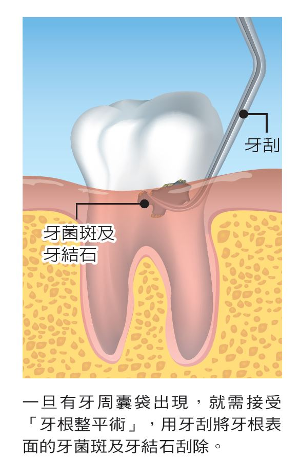 蘇文藝表示,健康正常的情況下,牙齦會緊貼著每顆牙齒,兩者之間會有 1 到 3 毫米的深度,但是包括牙齦炎在內的牙齦疾病,會加深這個空間、形成「牙周囊袋」,滋生更多的細菌,進而使得牙齦萎縮、牙齒鬆動,甚至脫牙等嚴重的後果,只有牙科的器械才有辦法深入囊袋清潔,甚至有時候洗牙還未必能清得乾淨,健保有一個項目叫「齒齦下刮除術(含牙根整平術)」 ,就是用更特別的器械除去牙周囊袋中的細菌、牙結石,由此可見,定期洗牙是最基本的清潔與保養,傳言說洗牙「刮傷保護層」為錯誤說法