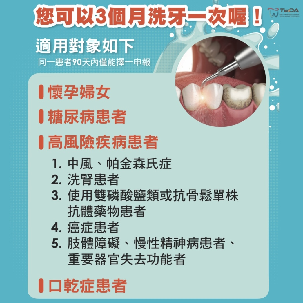 蘇文藝指出,健保給付 12 歲以上民眾每半年洗牙一次,但實際上每個人的口腔健康情況不同,民眾可以遵照牙醫師的醫囑,牙醫師要求下次什麼時候洗牙,那就依牙醫建議的時間、頻率定期洗牙,此外健保也針對「高風險」族群提供每 3 個月洗牙一次的醫療照護,讓懷孕、糖尿病,或是帕金森氏症、中風、洗腎、癌症等以及口乾症患者,能加強洗牙以提高口腔健康、降低口腔疾病的發生,蘇文藝強調,甚至有的病患口腔衛生真的很不好,他也會請病患不到三個月就要再來洗牙,以健保「牙周病統合治療方案」的方式追蹤病情、幫助病患,而不受限於支付項目規定什麼對象幾個月洗牙的問題。