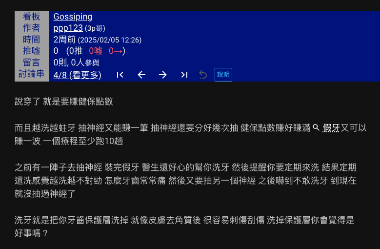 而且越洗越蛀牙 抽神經又能賺一筆 抽神經還要分好幾次抽 健保點數賺好賺滿 假牙又可以賺一波 一個療程至少跑10趟