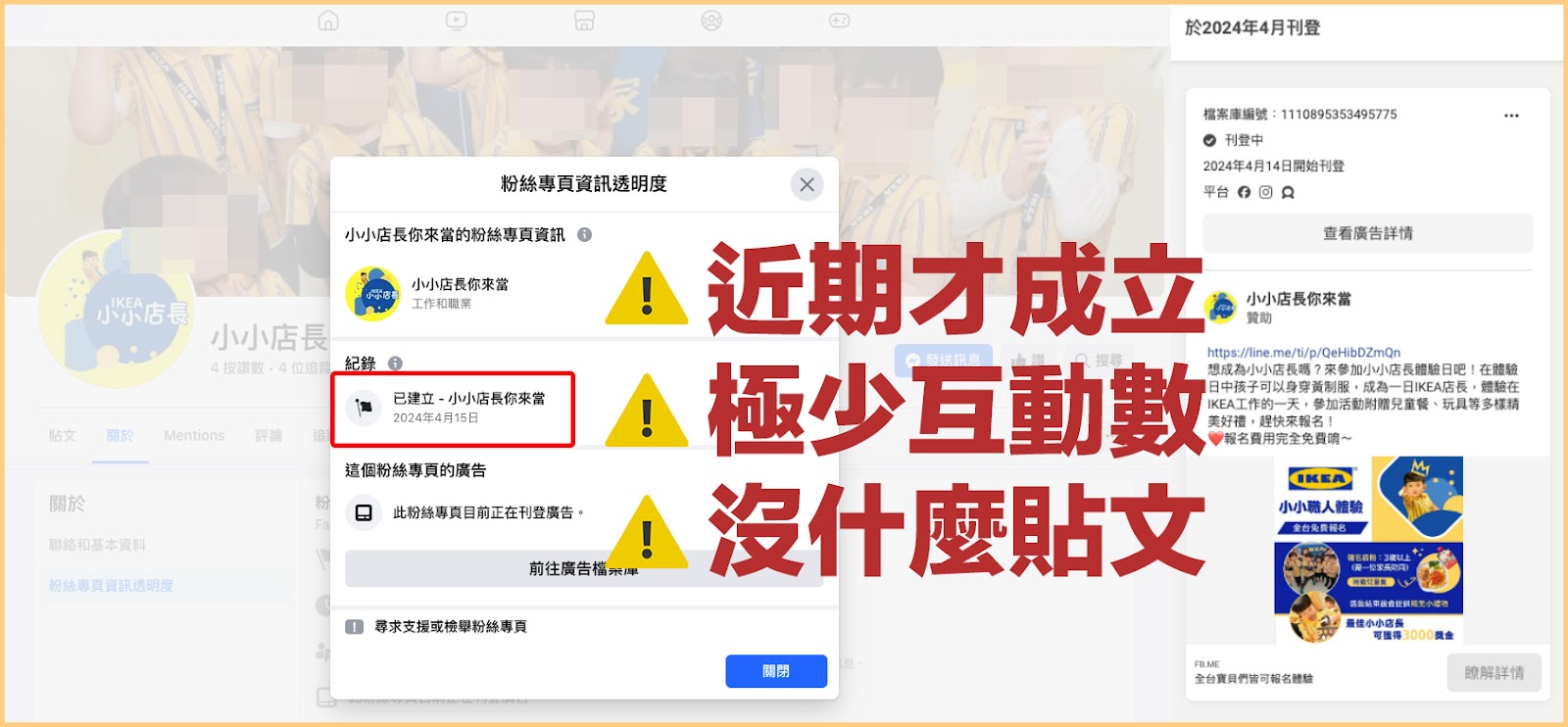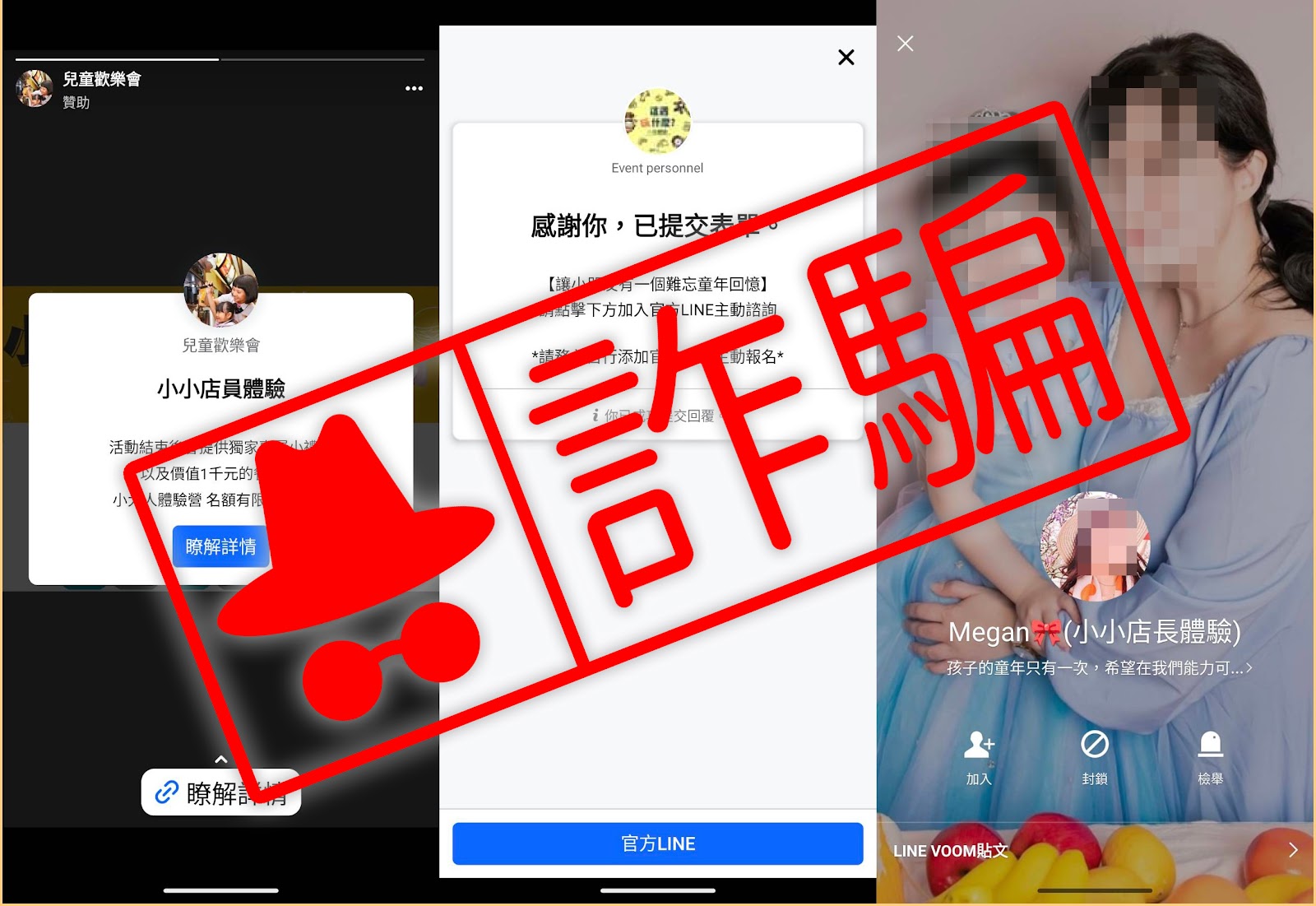 近期民眾回報,在社群平台貼文或限時動態,看到這樣「小小店長」、「小小職人體驗營」的廣告投放,要民眾加入 LINE 帳號並填寫個資來報名。事實上這是冒用品牌形象的假粉專詐騙廣告,幾可亂真!報名填寫很可能遺失個資或是加入不明 LINE 帳號,後續造成財損等狀況。警方提醒民眾務必提高警覺,並透過官方網站或直接打電話確認商家是否辦理該活動。