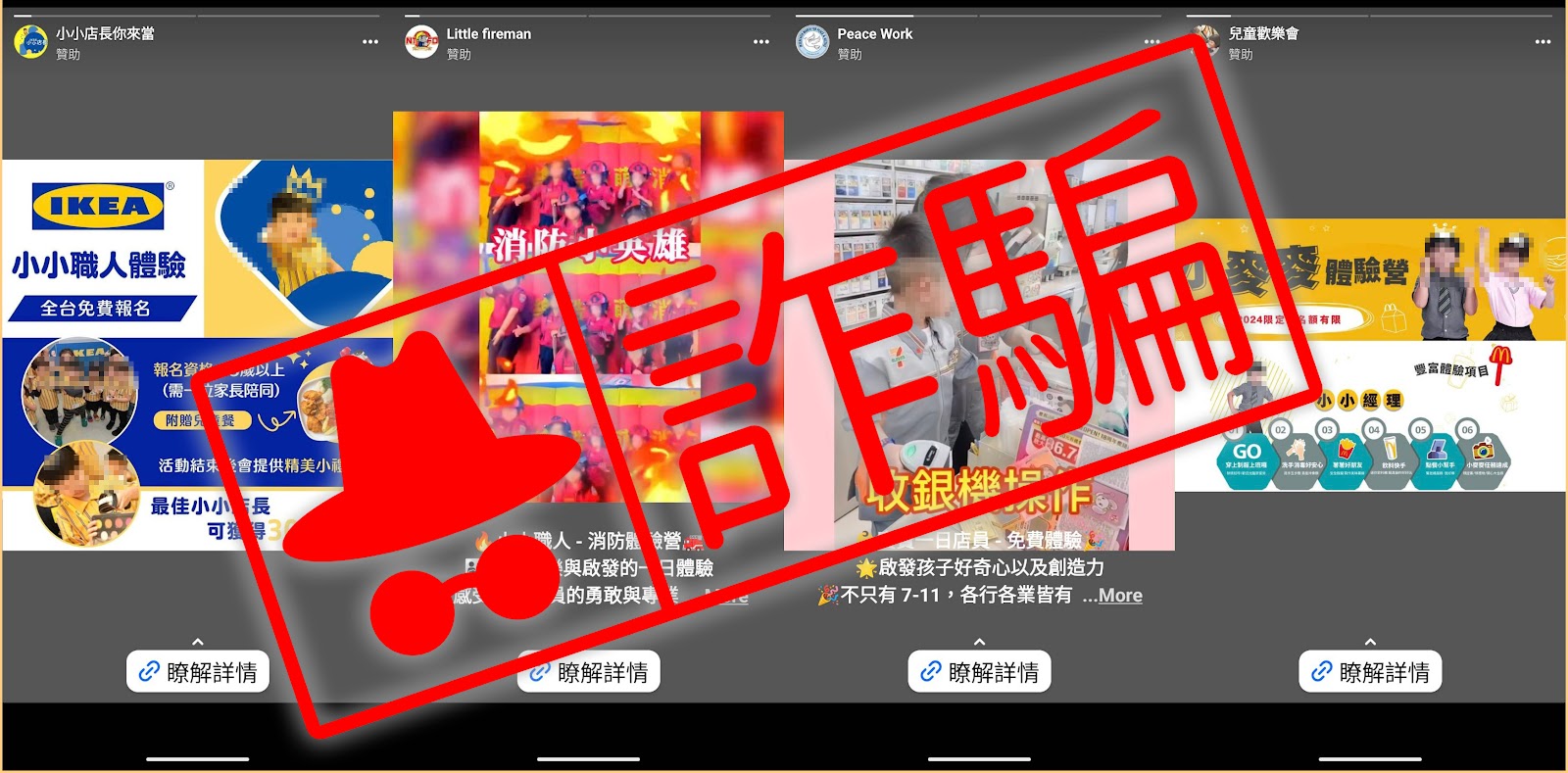 另外 MyGoPen 實際詢問警方,刑事警察局偵查員張佩愉表示,爸媽請冷靜!小小XX員體驗也可能是假的喲!近期發現詐騙集團看準爸媽認真安排孩子體驗生活,透過投放小小XX員體驗的廣告,讓爸媽點選報名填寫後,卻遺失個資、線上刷卡被盜刷。看到廣告都應該透過官方網站確認是否辦理該活動,或直接致電商家電話詢問,以免遭詐。