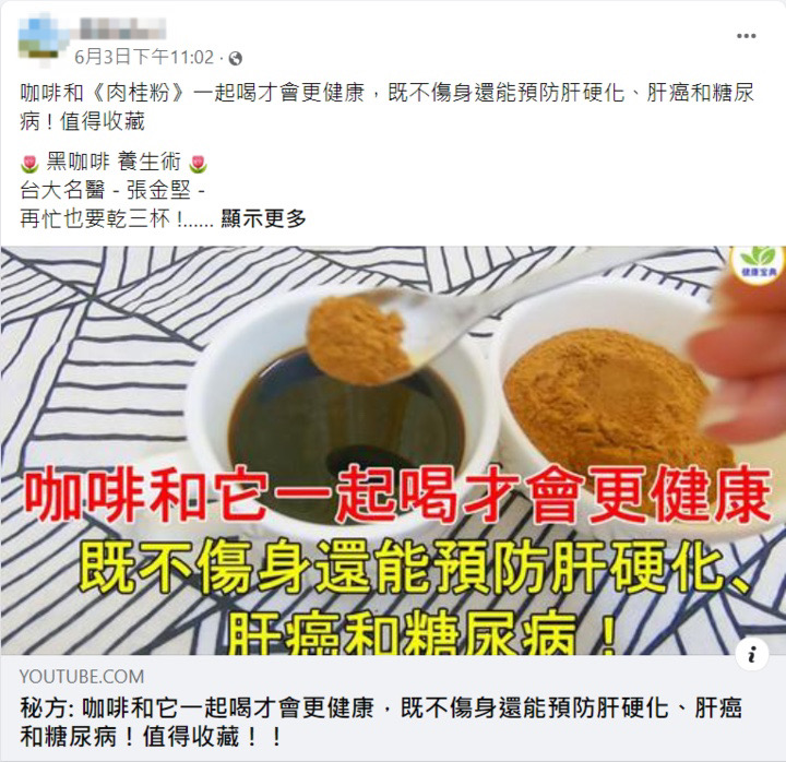 網傳「咖啡和肉桂粉一起喝才會更健康」貼文,並有 YouTube 影片連結,片中敘述肉桂對心血管疾病的好處,並提到喝肉桂咖啡能有降低肝癌、糖尿病、心臟病、阿茲海默症、巴金森氏症等五大好處。專家表示,肉桂對上述疾病的預防效果不是僅動物實驗就是缺乏實證,而咖啡對預防肝癌、糖尿病、高血壓的有較多研究佐證,醫界也普遍持適當攝取量對失智有幫助的看法。傳言強調肉桂,但其實咖啡反而較有科學實證,傳言的說法易誤導民眾。