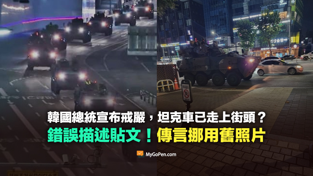 【錯誤】韓國總統宣布戒嚴令,坦克車已經走上街頭?傳言挪用舊照片