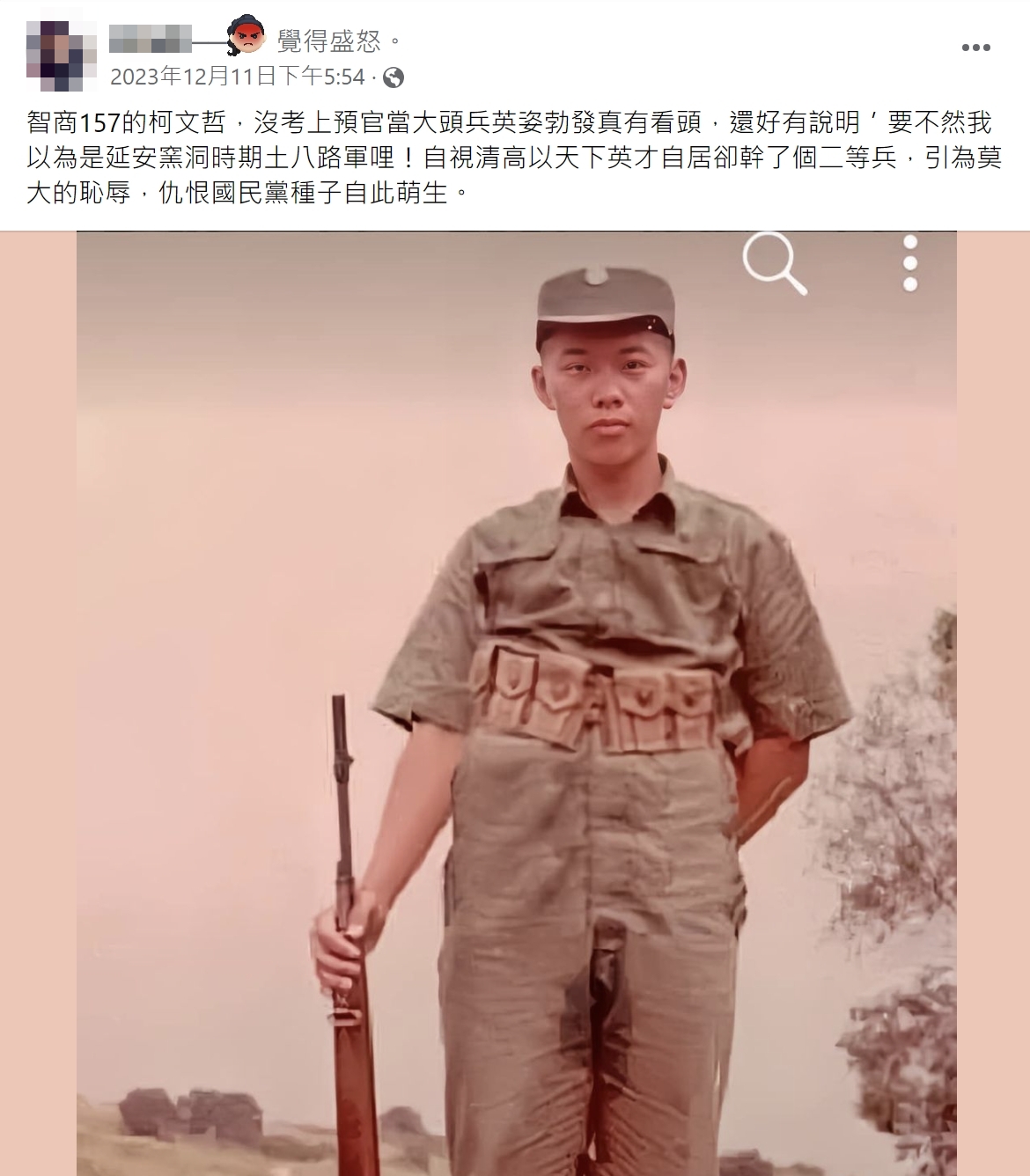 智商157的柯文哲,沒考上預官當大頭兵英姿勃發真有看頭,還好有說明'要不然我以為是延安窯洞時期土八路軍哩!自視清高以天下英才自居卻幹了個二等兵,引為莫大的恥辱,仇恨國民黨種子自此萌生。