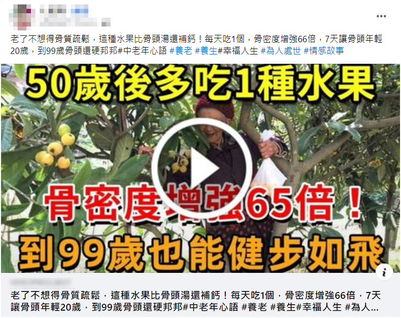 網傳「老了不想得骨質疏鬆,這種水果比骨頭湯還補鈣」、「每天吃 1 個,骨密度增強 66 倍」。但根據衛福部多年來宣導、國健署於 2018 年發布的「喝大骨湯補鈣?其實喝進去的的鈣質非常少!」衛教,大骨湯鈣含量極低,傳言說法明顯不專業。影片標題中還提到「每天吃1個,骨密度增強 66 倍」,但影片中卻沒有直接講到是哪一種水果,只在片中依序提到檸檬、柑橘類、山楂,但根據國健署、各大醫院等具公信力單位的衛教內容,這些水果雖含有維生素 C,但維生素 C 只是「幫助」鈣質吸收,在國人飲食普遍嚴重缺鈣的情況下,直接補鈣才是比較重要的有效方法。
