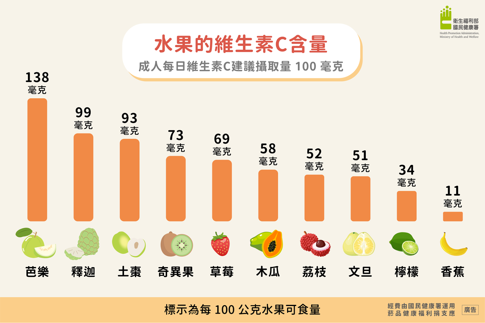 (1)水果類「維生素 C」含量排行榜的首位並非檸檬,而是芭樂,第二、三名則分別是釋迦和龍眼。