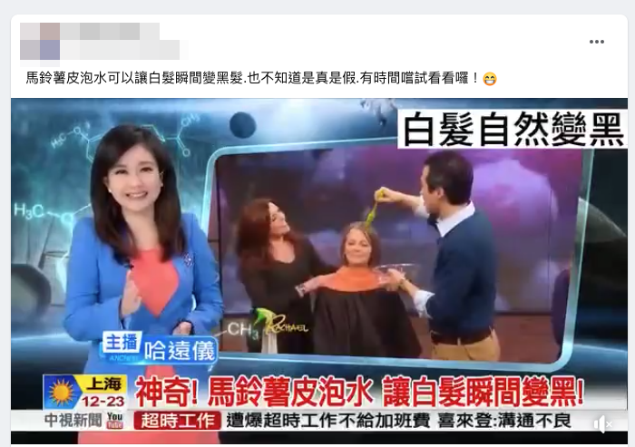 網傳「白髮自然變黑」影片,內容提及將馬鈴薯削皮泡水、然後塗在頭髮上「可以讓頭髮重新黑起來」。但專家表示,不管是「馬鈴薯染」或是其他化學的暫時性染劑,顏色及持久度無法與永久性染劑相比,雖然國際間已相當程度地澄清染髮劑的致癌疑慮,但如果民眾還是不放心,可以遵守一周內不又燙又染、每次染間隔 3 個月,即使補染,一年染髮次數也應低於 12 次。傳言從 57 秒後明顯剪接為不同畫面、且是不同旁白聲音,右邊並出現「非藥物專利成份 專業人士大推等字卡」,疑似為產品廣告的片段畫面,則不在此次查核範圍。