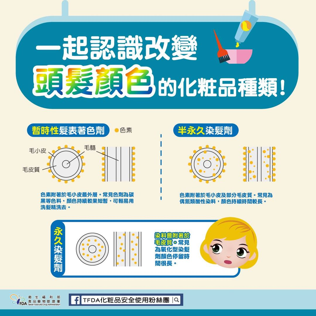MyGoPen 查詢具代表性的公開資料,市售染髮劑的分類根據食藥署臉書「TFDA 化粧品安全使用」於 2021 年 9 月的「改變頭髮顏色的化妝品種類」貼文,主要有三種類型: