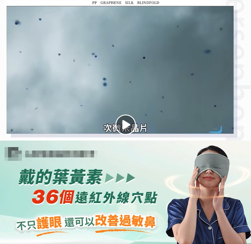 網傳「石墨烯修復眼罩」、「戴的葉黃素」影片,片中提到每天用 15 分鐘,可以修復包括「夜盲症、黃斑部病變、飛蚊症、青光眼、老花與白內障」等 6 種眼睛疾病,以及失智、腦中風等 8 種疾病。傳言雖沒使用「治療」等字眼以規避法規,但已是暗示、隱含,專家表示不可能一種東西可以治好幾種病、「醫學上不可能」,提醒民眾各種按摩、磁石、電流等特殊眼罩,都應避免使用以免弄傷「玻璃體」變成「飛蚊症」,甚至近來流行的超音波洗臉機也應避免使用在眼皮上或眼睛周圍。