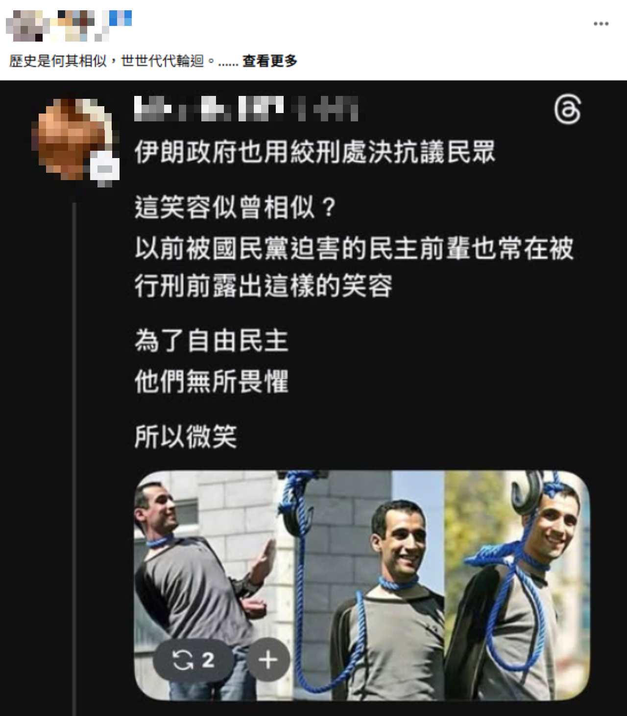 伊朗政府也用絞刑處決抗議民眾 這笑容似曾相似? 以前被國民黨迫害的民主前輩也常在被行刑前露出這樣的笑容 為了自由民主 他們無所畏懼 所以微笑