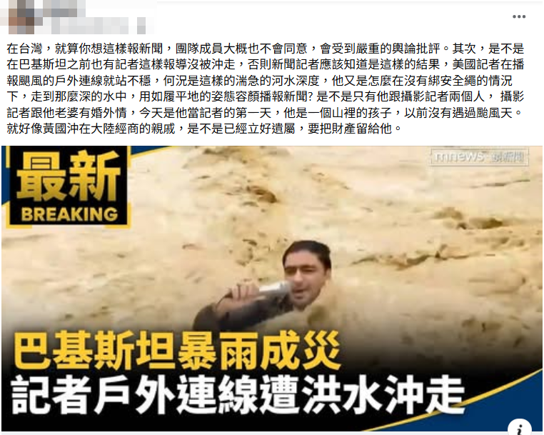 MyGoPen 檢視網傳訊息所附連結,可以找到民視、鏡新聞、華視新聞等媒體的報導,內容聲稱一名巴基斯坦記者報導當地暴雨,冒險站在湍急的泥流中連線,最終被沖走。