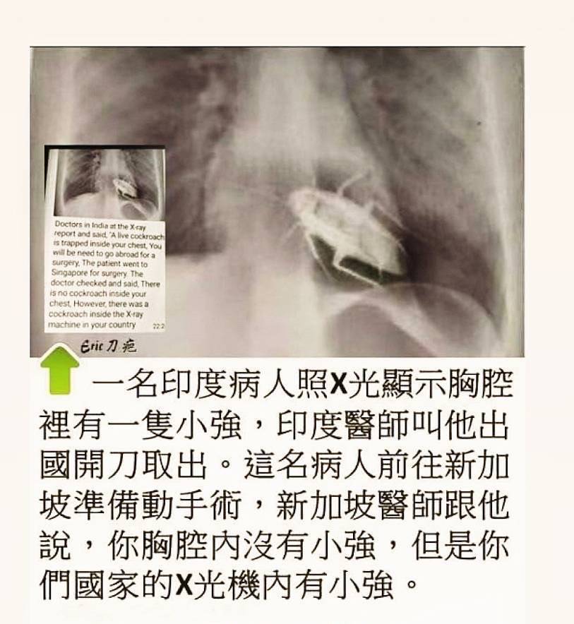 一名印度病人照X光顯示胸腔裡有只小強,印度醫師建議他開刀取出。這名病人最終選擇前往新加坡動手術,新加坡醫師跟他說,你可以回家了,因為你胸腔內沒有小強,小強是在你們醫院的X光機內。