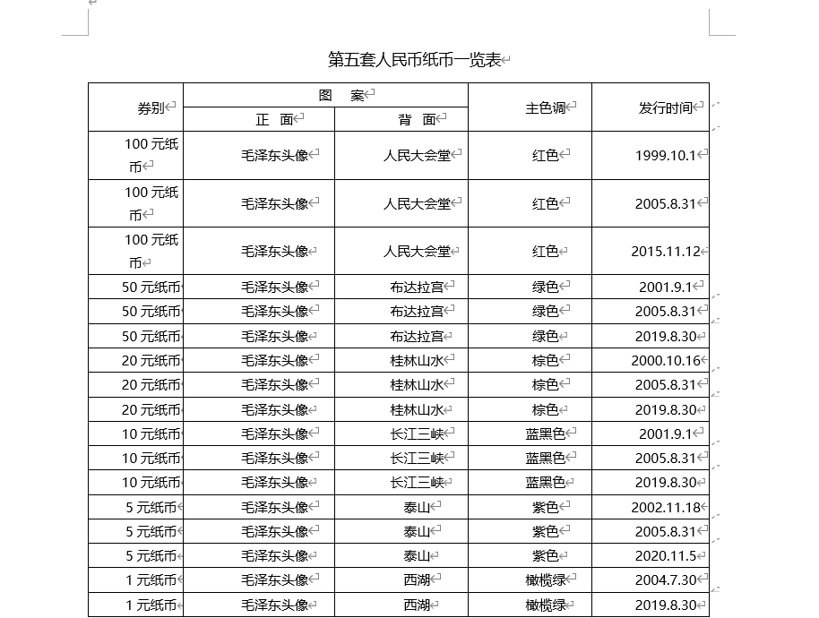 (一)根據直屬於中國人民銀行、中國官方法定貨幣製造企業的「中國印鈔造幣集團」官網資訊,目前為止中國共發行過五套人民幣,現在最新的是第五套人民幣,而這一套又按照年份分為 1999 年版、2005 年版、2015 年版、2019 年版、2020 年版。