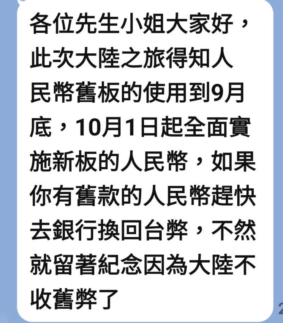 網傳 10 月 1 日起全面實施新版人民幣的訊息?