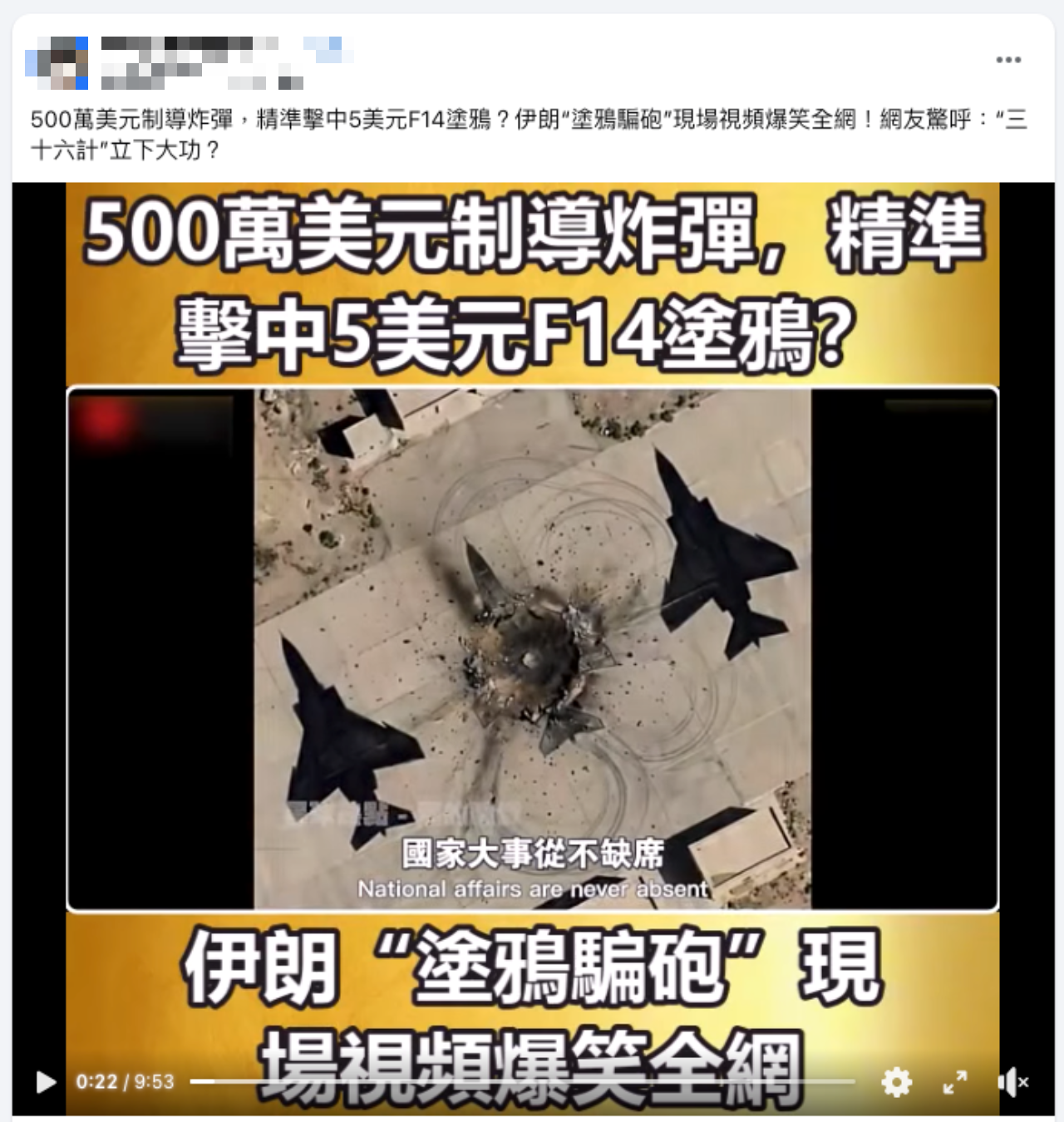 網傳「500 萬美元制導炸彈,精準擊中 5 美元 F14 塗鴉」、「伊朗塗鴉騙砲」的訊息和影片,宣稱伊朗透過在地面上繪製戰機塗鴉,欺騙美軍將其當成目標進行攻擊。經查證,傳言影片有許多版本,主要使用兩段轟炸畫面,其中一則其實是 2025 年以色列轟炸德黑蘭的舊片段,不是近期美以伊戰爭的真實畫面,為誤導訊息;軍事上確實存在視覺欺騙的誘餌與欺敵戰術,但至本報告截稿前,無論是美國、以色列或伊朗,均無任何公開資料或官方回應可以證實傳言的塗鴉說法。