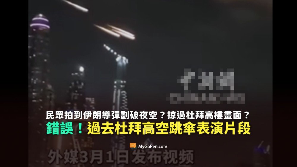 【錯誤】民眾拍到伊朗導彈劃破夜空?掠過杜拜高樓畫面?非近期影片!過去杜拜高空跳傘表演