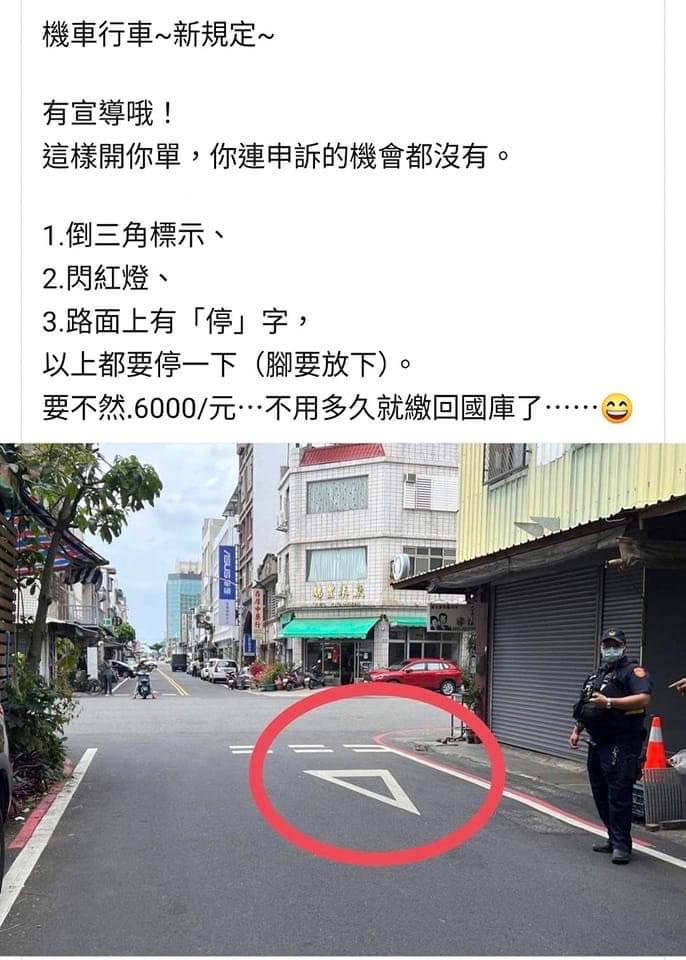 機車行車~新規定~ 有宣導哦! 這樣開你單,你連申訴的機會都沒有。 1.倒三角標示、 2.閃紅燈、 3.路面上有「停」字, 以上都要停一下 ( #腳要放下 )。 要不然.6000/元⋯不用多久就繳回國庫了⋯⋯