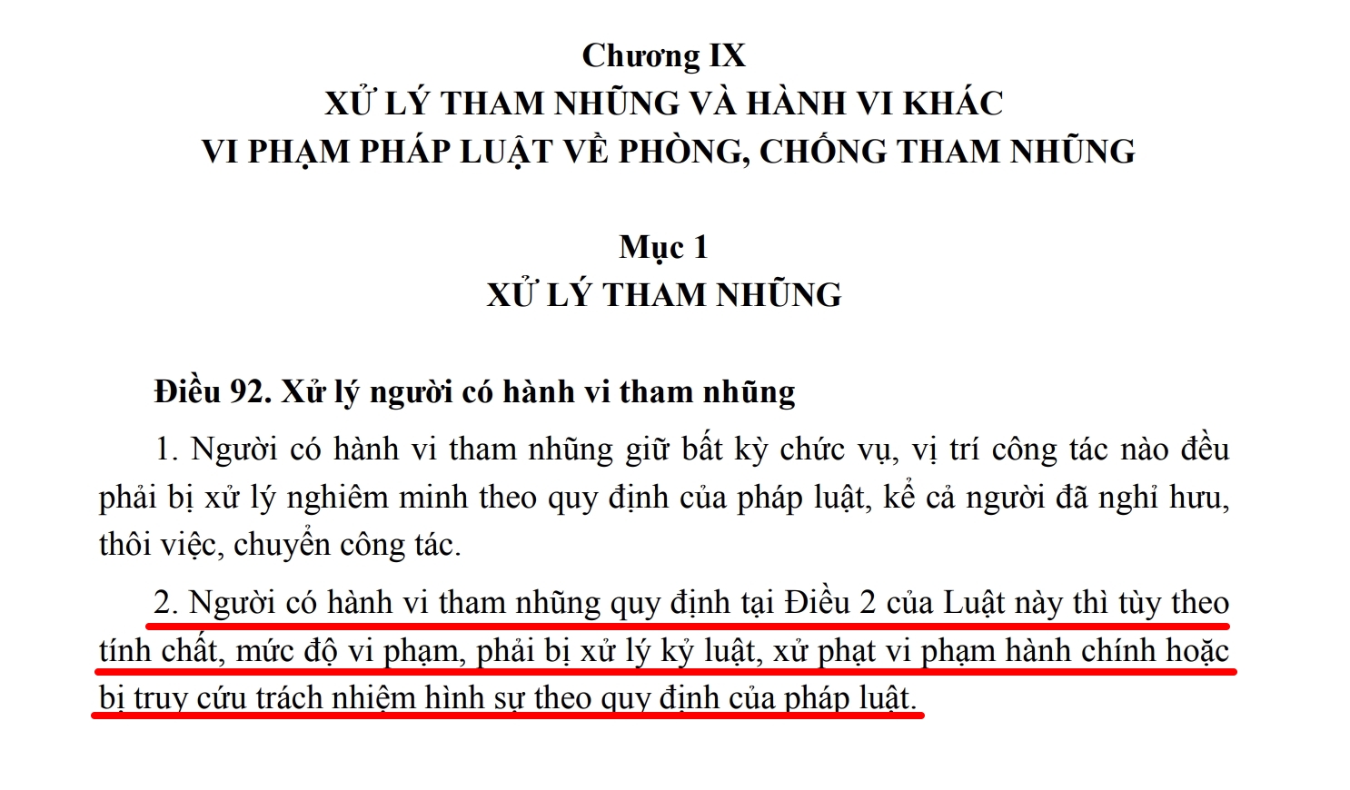 上述可知,違反《反貪腐法》可依刑法究責,目前越南使用的是 2015 年 11 月頒布的《刑法》,第 40 條〈死刑〉( Tử hình )有列出貪汙罪中「特別嚴重的犯罪份子」,可處死刑;不過但書也提到,因貪汙罪被判處死刑定讞的人,如果主動退回四分之三不法所得,就不能執行死刑,而是改為無期徒刑。